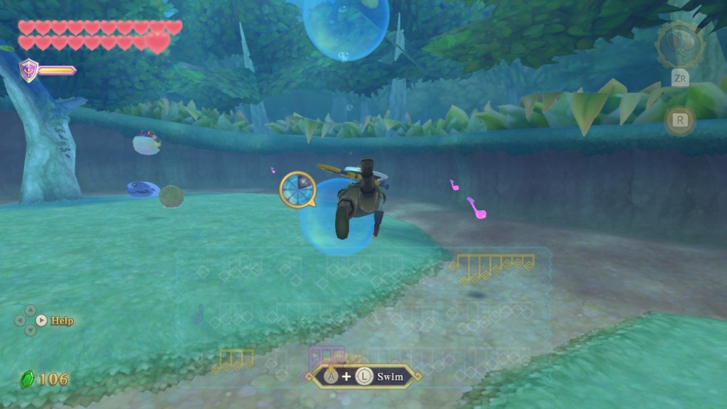 Musical instruments often play a role in Link’s adventures, and while the harp is a cool idea, it’s no ocarina; that’s for sure. You merely strum the harp from left to right and vice versa repeatedly to a certain rhythm to accomplish what it’s needed for. You don’t learn new songs rather just new slightly different rhythms. At least it does lead to a ridiculous mini game at the bar in Pumpkin’s Landing.