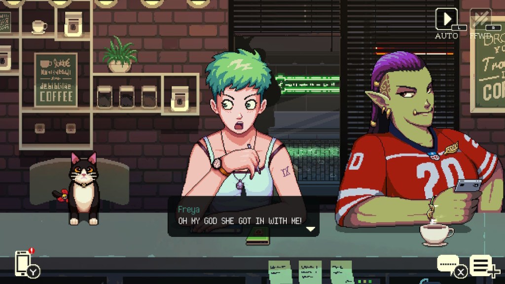 If you ever wanted your visual novels with a side of barista-ing, you should check out the quaint and soothing 5 hour or so journey that is Coffee Talk. The world is full of interesting characters based on fantasy (like orcs and vampires), and it is just super chill to make some latte art while lightly bobbing your head to the calm soundtrack.
