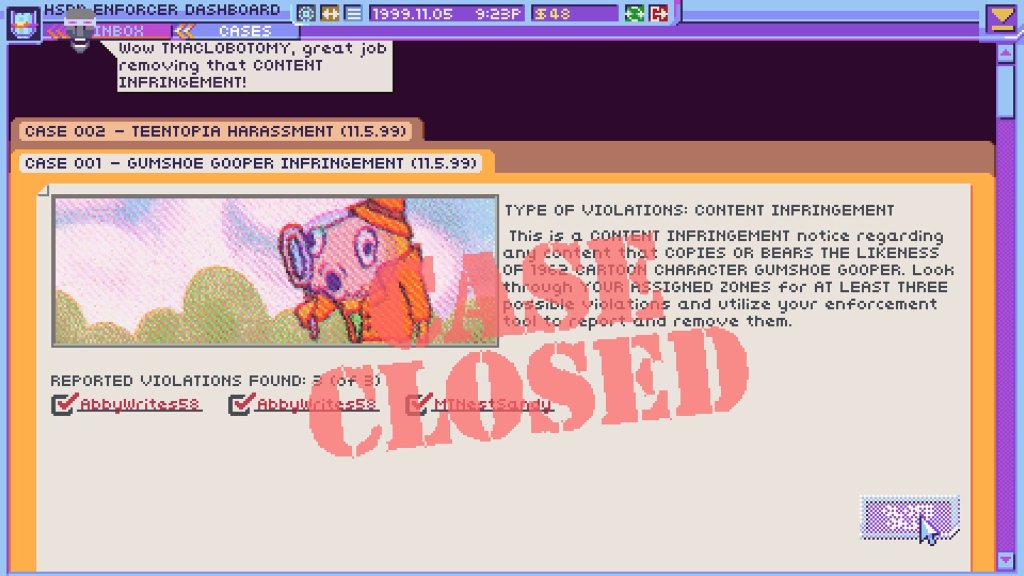 1. Ah, man. Kind of disappointing that you dropped Hypnospace after one case closed. I highly, highly urge you to try to pick it up again. Realize you can go at your own pace and are in no rush. I know what you mean about the visuals being a tad overwhelming or giving you a headache, but truly this game is made with so much love.