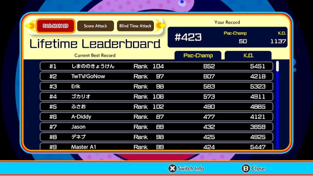 Looking to fill the void in my life left by Nintendo closing shop on Mario 35, I found an almost worthy successor in Pac-Man 99 where you attempt to survive as long as possible as our ghost-eating friend while dodging never-ending waves of ghosts being sent by the other 98 players. I managed to find my footing incredibly early and climbed all the way up to #423 in the world. Following my 50th career win, I realized I had achieved enough and retired while still on top.