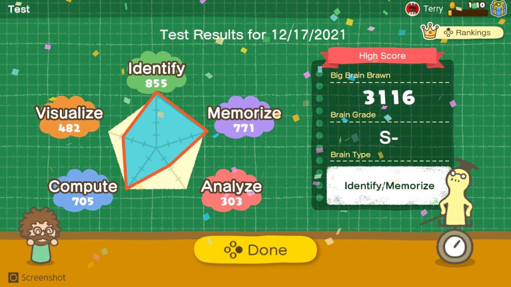 One day I will prove that I am smarter than the weird host of Big Brain Academy. Right now, I’m just about 200 points off with a Brain Grade of S- and Brawn of 3100. This game is well suited for a nightly little brain challenge by taking a few tests that throw 5 random games at you and seeing how far you can go, and, as such, is often a part of my bedtime routine.