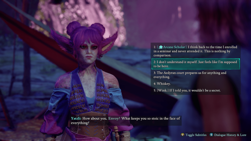 Bluntly put, my character was a big old nerd modeled after my actual kick ass wife. They were an “Arcane Scholar” specializing in wizardry, and throughout my hundreds of interactions with NPCs, I was constantly able to provide the nerdiest answers possible thanks to that built in archetype. I felt like almost every encounter gave me ways I wanted to respond to as my character whether I was feeling angry, sarcastic, tired, or just plain deserving of a wedgie. I never felt like the game was shoehorning my experience in to something I did not want it to be.
