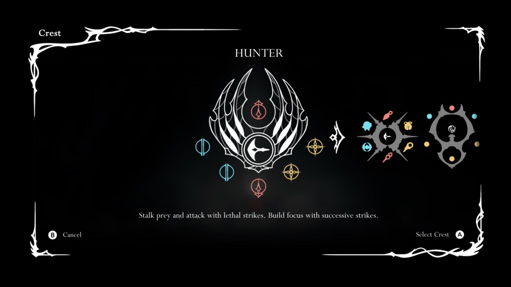 Hollow Knight had a great deal of playstyle customization allotted by its charm system, and Silksong takes it a step further with crests. Crests impact you attacks (especially your downward strikes), what and how many tools/charms you can bring along, and they all impart some special skill related to healing. I imagine you could have wildly different playthroughs depending on what you choose to go with. It seems like the early favorite (and what I used almost exclusively once I got it) is the Reaper Crest which plays the most akin to what people are familiar with from Hollow Knight, while also amping up precious silk production and having a balanced set of charms and tools available.