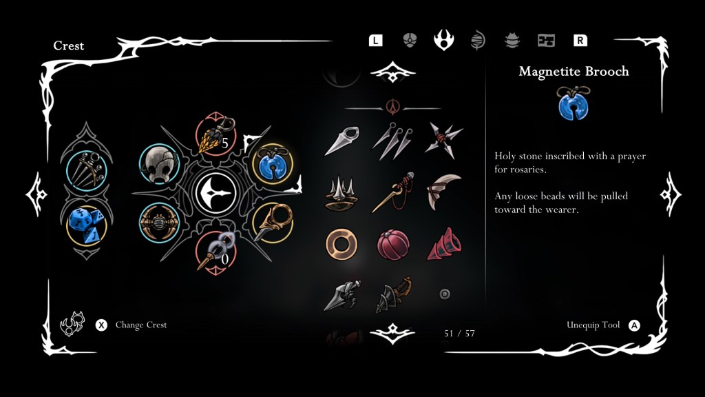 Technically everything you add to your crest is called a tool in this game, but I am going to specifically be talking about the red ones since the yellow and blue are essentially charms from HK. Now, aside from normal attacks and silk skills, Hornet can bring along a variety of tools to throw at enemies which range from blasters to spikes to floor tack traps. They really liven up combat and can provide a much needed lifeline in a boss battle. Just be sure to do the Rite of the Pollip quest to get the most out of them.