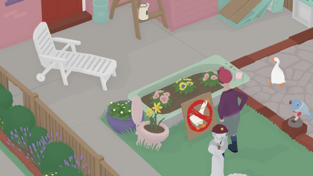 Untitled Goose Game is perhaps the greatest gaming achievement of the year. Sure, it's not the most technically advanced game or even the most fun one, but its surreal rise from a joke amongst a team of just 4 game devs to the top of the Nintendo eShop and the national consciousness is nothing short of remarkable. The biggest game on Nintendo Switch right now isn't the adorably recreated, big budget Link's Awakening; it's a prank game about being an asshole goose. The devs could have easily phoned it in and relied purely on the ridiculous premise to move units and provide them with success, but you can tell they truly poured their hearts into this absurd operation as evidenced by each hilarious puffing up of the goose's wings, every annoyed resident's reaction to a honk, and all the poor, damaged property left in the mischievous goose's wake. They didn't just create a meme-machine, they truly delivered on the promise of being an asshole goose. While I thoroughly enjoyed my time as our bird anti-hero from the start, the true glory of the world's favorite goose's low stakes carnage creating prowess fully crystalized for me in the game's fantastic third area, The Back Gardens.